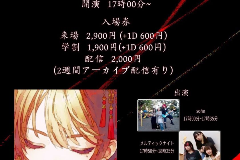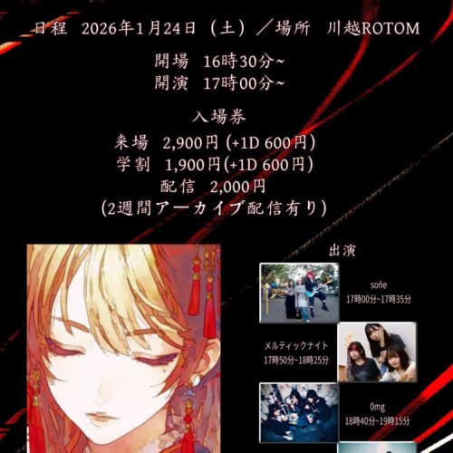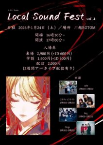しのっちPre『Local Sound Fest』Vol.2 1月 24 Sat 2026 ALL EVENTSPICK UP 出演 ・sōne ・Clarge ・0mg ・メルティックナイト 料金 🎫:¥2,400(ADV)/¥2,900(DOOR)+1D ※学生証掲示で遠征1,000 OFF 時間 open 16:30/start 17:00 前のスケジュール 次のスケジュール
