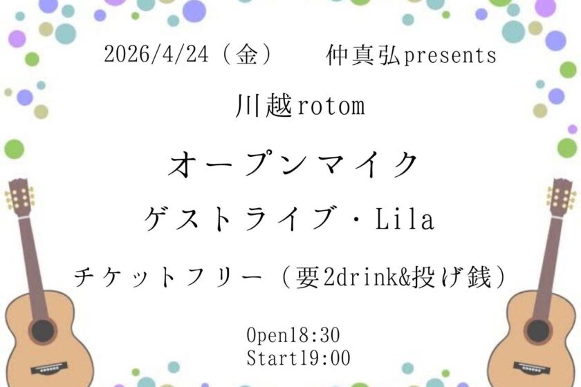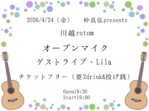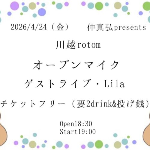 仲真弘Pre. オープンマイク 4月 24 Fri 2026 ALL EVENTSPICK UP 〜出演〜 Lila 〜料金〜 Ticket FREE + 2D(¥1200) 〜時間〜 OPEN 18:30 START 19:00 前のスケジュール 次のスケジュール