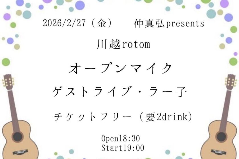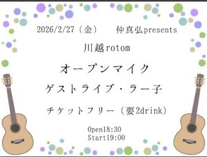 仲真弘Pre.『オープンマイク』 2月 27 Fri 2026 ALL EVENTS 仲真弘Pre.『オープンマイク』 仲真弘Pre.『オープンマイク』 OPEN 18:30 START 19:00 ■入場 チケットフリー・要2D ■ゲストライブ ラー子 前のスケジュール 次のスケジュール