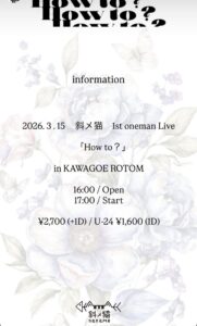 斜メ猫 1st one man-live 「How to?」 3月 15 Sun 2026 ALL EVENTSPICK UP Thank you sold out! 〜出演〜 斜メ猫 〜料金〜 一般 ¥2700(+1D¥600) U‐24 ¥1600(+1D¥600) 〜時間〜 OPEN 16:00 START 17:00 前のスケジュール 次のスケジュール