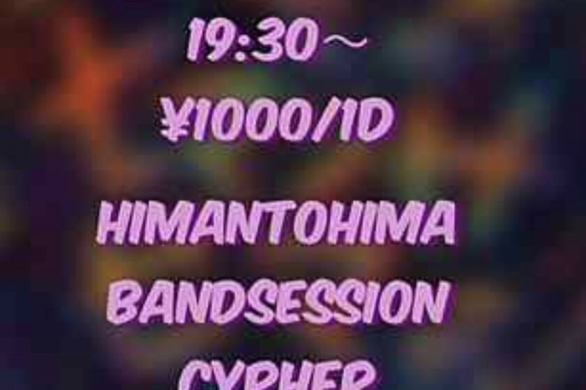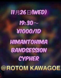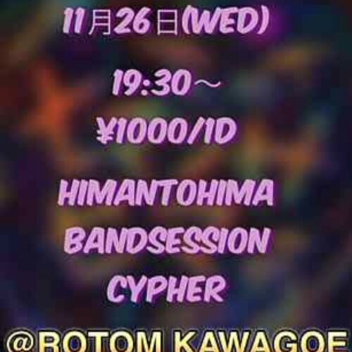 HIMANTOHIMA BAND SESSION CYPHER 11月 26 Wed 2025 ALL EVENTS ---------------------------------------------- OPEN 19:30 ENTRANCE 1000yen 1D付き お問い合わせは『contact』からお願いいたします。 前のスケジュール 次のスケジュール