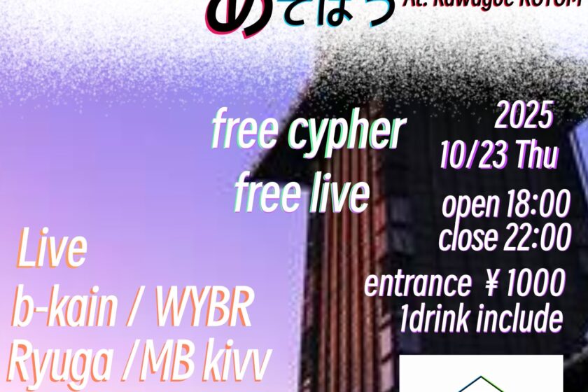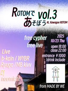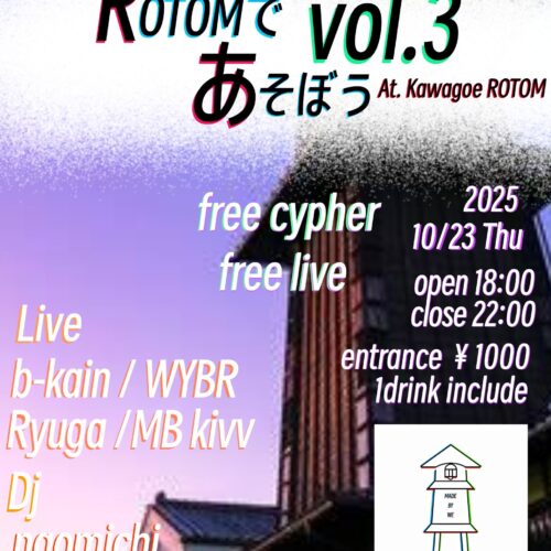 ROTOMであそぼうvol.3 10月 23 Thu 2025 ALL EVENTSPICK UP free cypher / free live 出演 b-kain/WYBR/Ryuga/MB kivi. DJ Naomichi 料金 ENTRANCE ¥1000(1DRINK付) 時間 open 18:00 前のスケジュール 次のスケジュール